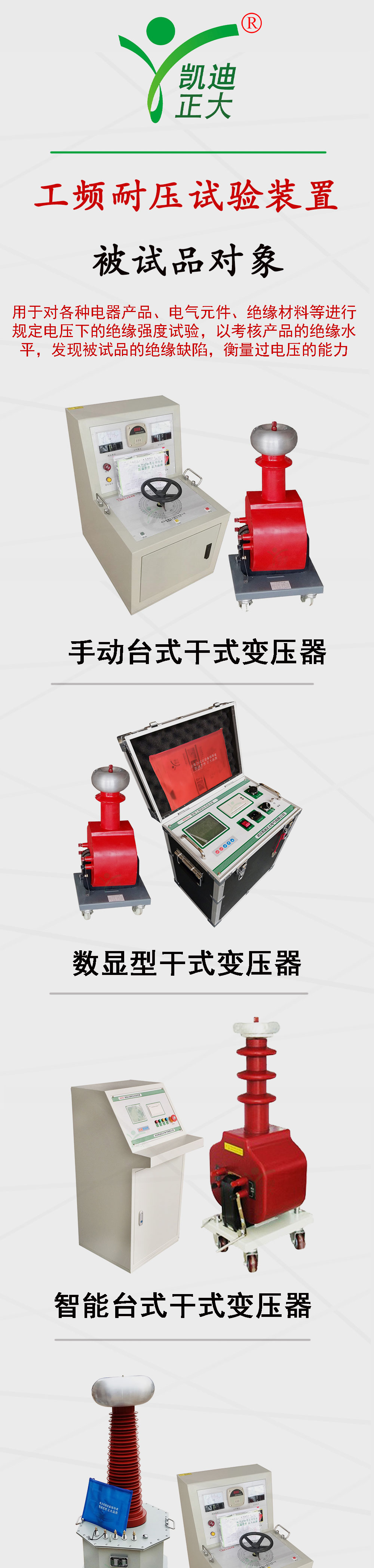 KDGTB工頻耐壓試驗裝置是根據國家較新電力行業標準而設計的、性能新的的耐壓試驗設備,用于對各種電器產品、電氣元件、絕緣材料等進行規定電壓下的絕緣強度試驗,以考核產品的絕緣水平,發現被試品的絕緣缺陷,衡量過電壓的能力。