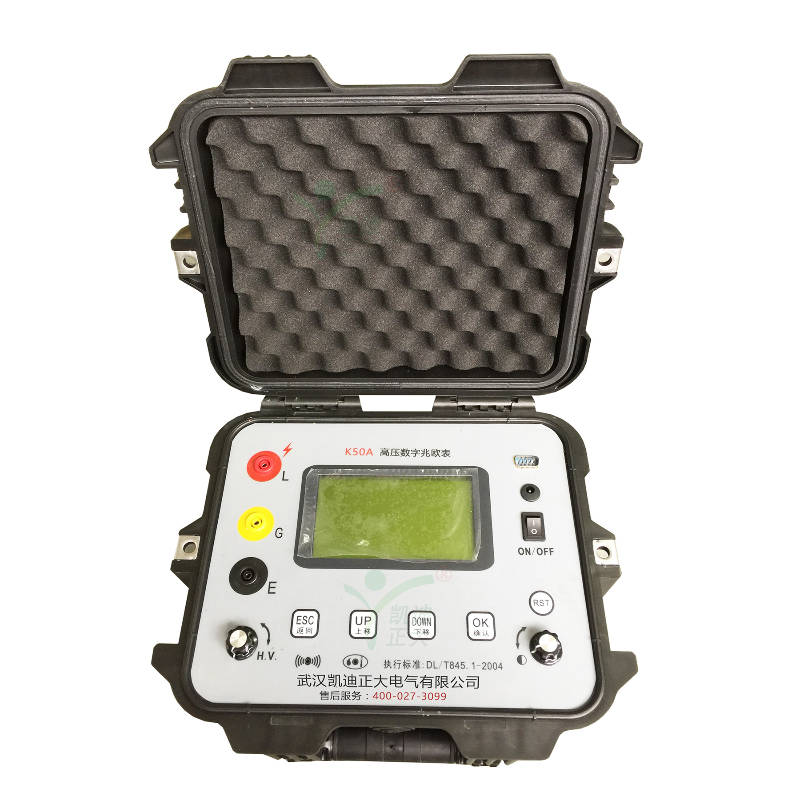 KD50A高壓絕緣電阻測試儀具有50V、100V、250 V、500V、1.0kV、2.5kV、5.0kV、10.0kV共8個電壓輸出檔,測試最大可達10TΩ。容量大、抗干擾強、液晶屏同步顯示、交直流兩用、操作簡單、自動計算各種絕緣指標、吸收比、極化指數、各種測量結果具有防掉電功能等特點。是測量大容量變壓器、互感器、發電機、高壓電動機、電力電容、電力電纜、避雷器等絕緣電阻的測試儀器。