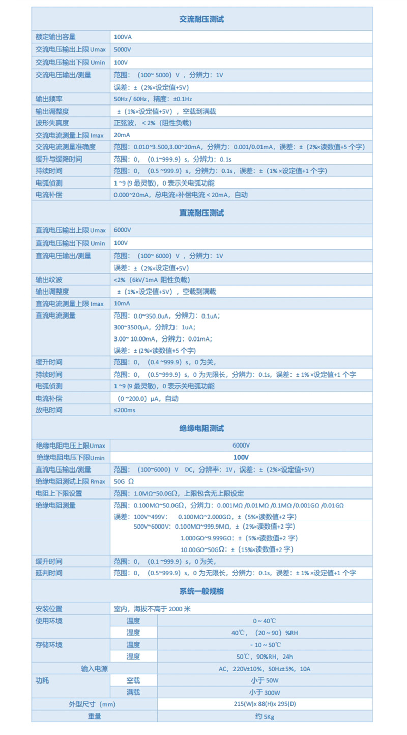 輸出電壓范圍:5Kvac/20mA、 6kVDC/10mA;