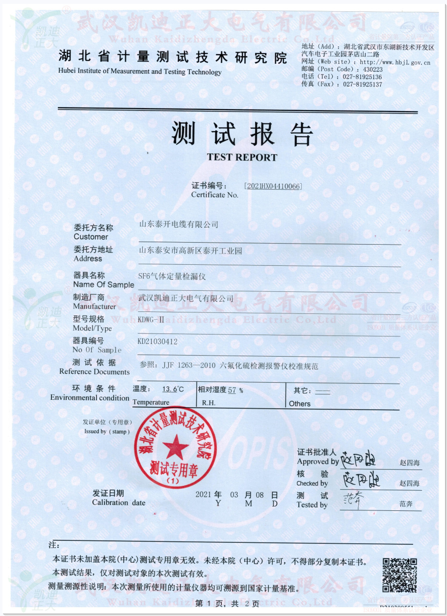 泰開電纜從事輸變電設(shè)備制造、低壓電器、專用汽車等多種行業(yè)的大型企業(yè)集團(tuán)。在輸變電行業(yè)具備了研發(fā)、生產(chǎn)與銷售550千伏及以下電壓等級輸配電設(shè)備總成套供貨、電站工程項(xiàng)目總承包建設(shè)的能力。需要六氟化硫的檢測設(shè)備,這次采購的KDWG-II型SF6氣體定量檢漏儀用于設(shè)備的SF6氣體檢漏,我們?yōu)槠渫扑]了KDQH-12Y-54-150L氣體回收凈化裝置、KDQC-33氣體抽真空充氣裝置等設(shè)備。采購的設(shè)備須有湖北省計(jì)量院的測試報告,這次獲得計(jì)量院測試報告。