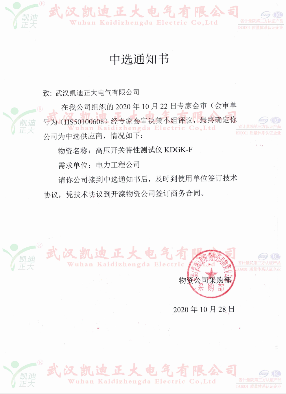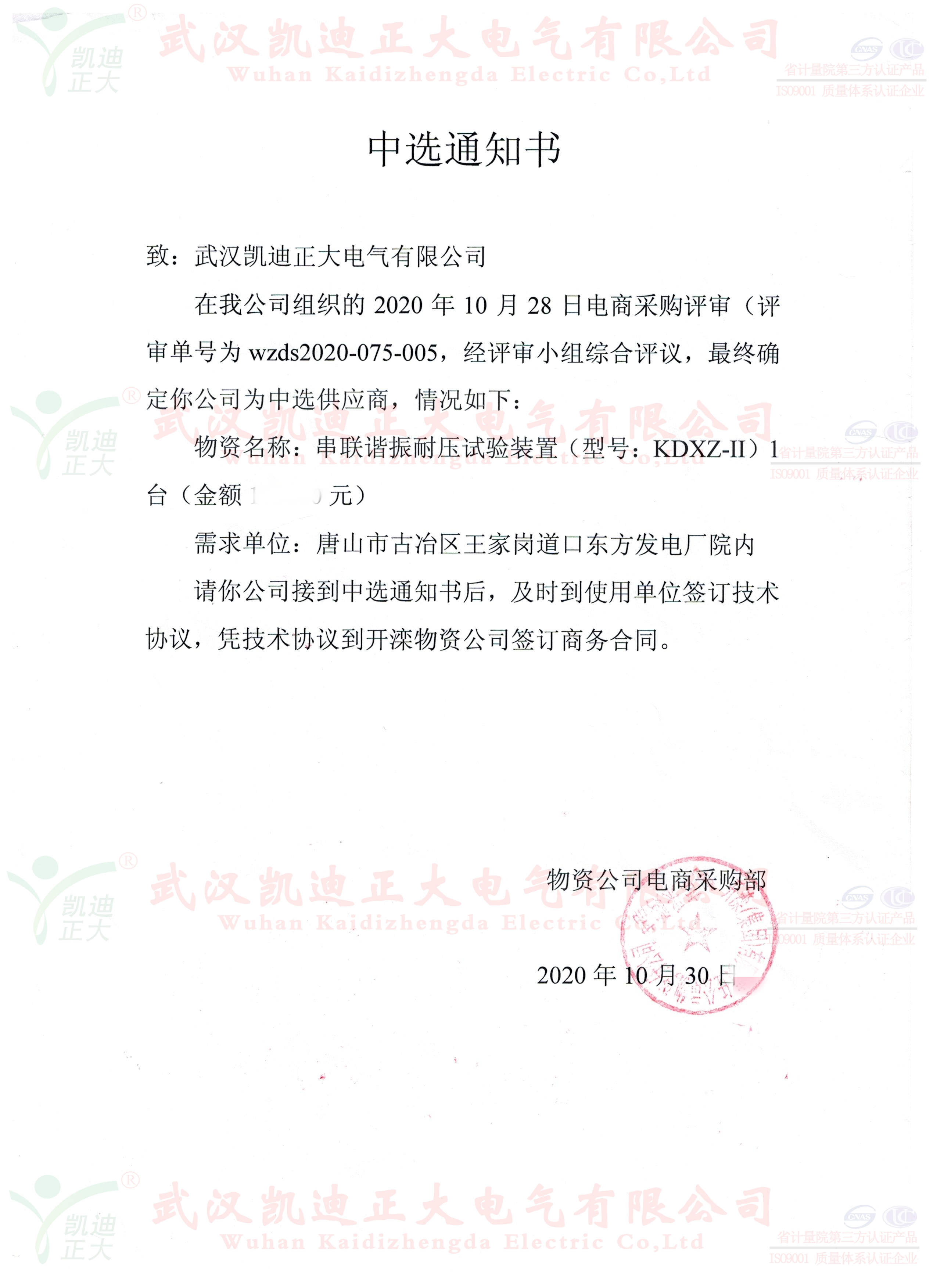 誰無暴風勁雨時,守得云開見月明。這個11月可以說是灰蒙蒙的,經(jīng)歷了洗刷.......。我司與國內(nèi)大型鋼鐵企業(yè)的合作,各大煤業(yè)集團均獲得訂單。這次是開灤集團的東方電廠公開詢價采購KDXZ-II串聯(lián)諧振耐壓試驗裝置、KDGK-F高壓開關(guān)機械特性測試儀等設(shè)備。在與多家電氣設(shè)備制造商的競標中,我司以優(yōu)質(zhì)口碑、多項專利技術(shù)、精準售后等高分獲得評標組的認可。獲得中選供應(yīng)商。