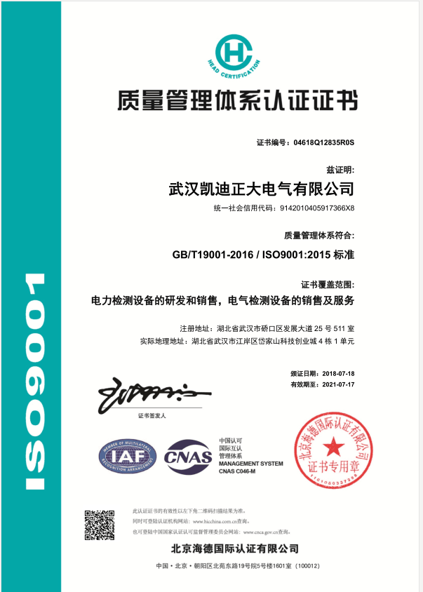 武漢凱迪正大最新版ISO9001:2015標準質量管理認證證書