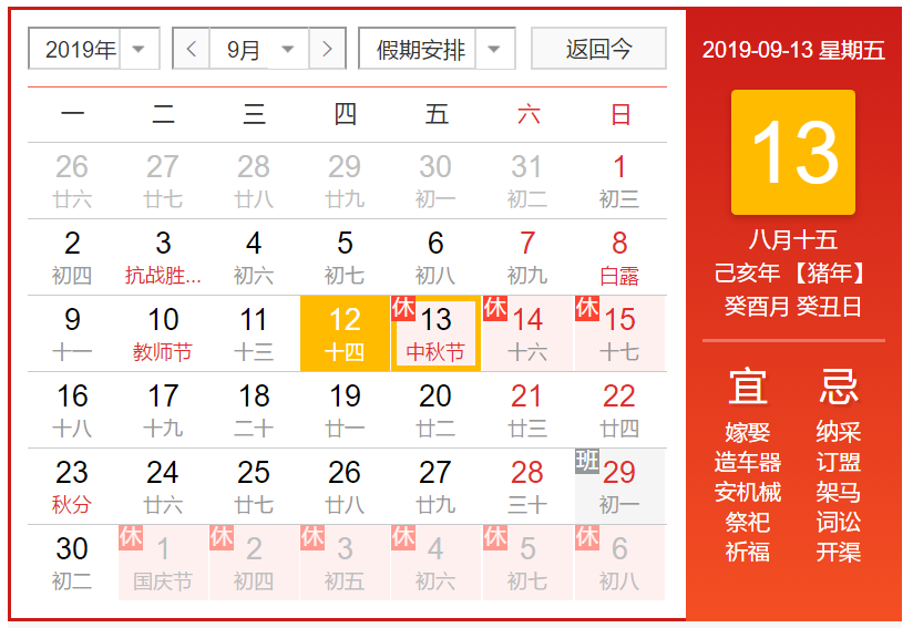 根據國務院2019年中秋節放假通知: