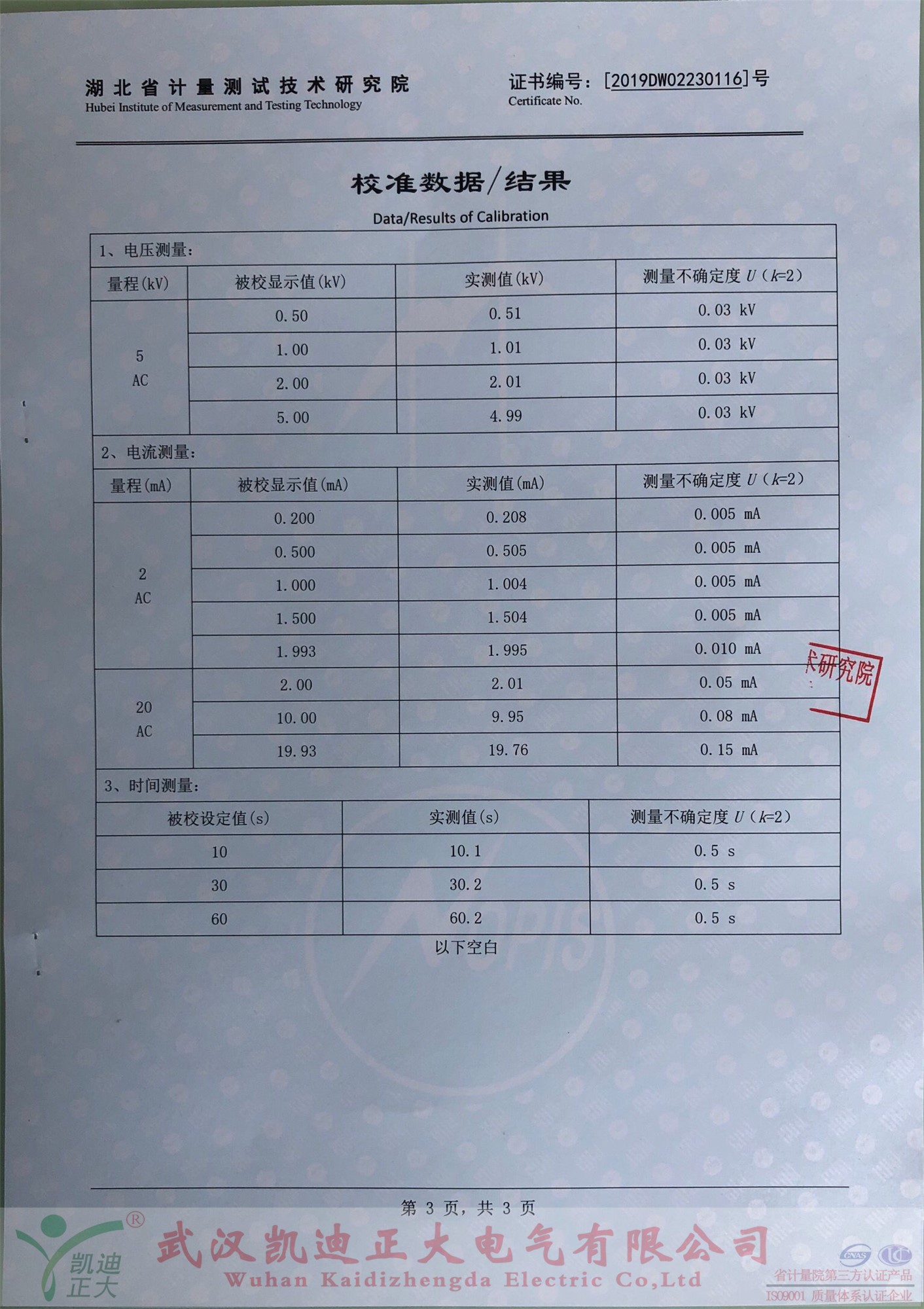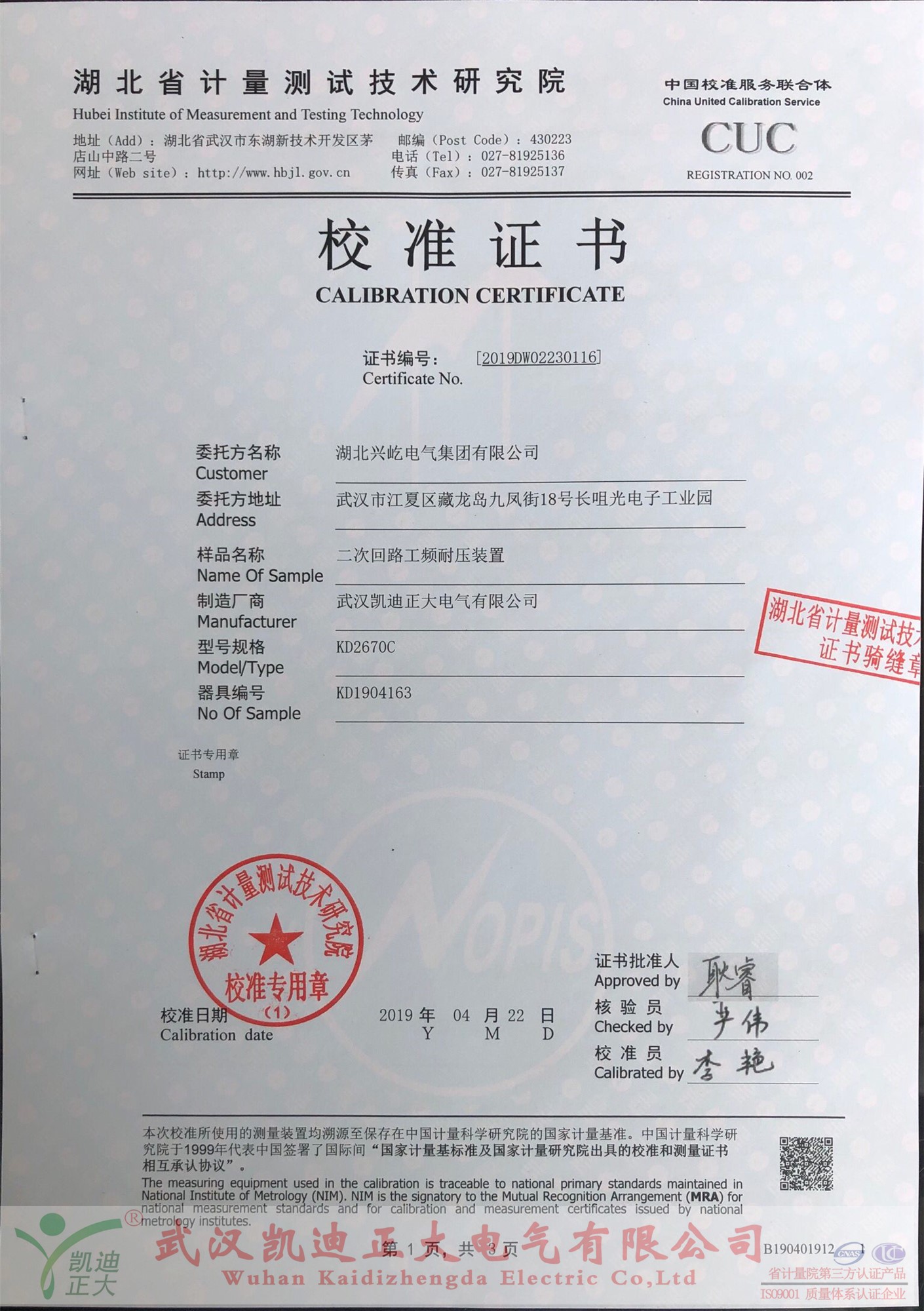 購買后便送往中國校準(zhǔn)服務(wù)聯(lián)合體-湖北省計(jì)量測(cè)試技術(shù)研究院檢定,由省計(jì)量院出具的《校準(zhǔn)證書》,證書編號(hào):2019DW02230116,校準(zhǔn)員:李艷,檢驗(yàn)員:嚴(yán)偉,證書批準(zhǔn)人:耿睿。