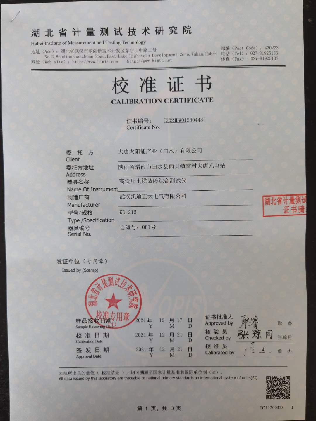 2021年12月22日,大唐太陽(yáng)能產(chǎn)業(yè)(白水)有限公司采購(gòu)我公司一批高低壓電纜故障綜合測(cè)試儀。為彰顯本公司產(chǎn)品的實(shí)力與質(zhì)量,凱迪正大雷總攜帶本公司生產(chǎn)的KD-216高低壓電纜故障綜合測(cè)試儀前往湖北省計(jì)量測(cè)試技術(shù)研究院中南國(guó)家計(jì)量測(cè)試中心對(duì)產(chǎn)品進(jìn)行檢測(cè),經(jīng)過(guò)多次測(cè)量與檢測(cè)后,產(chǎn)品完整通過(guò)每一條檢測(cè)并獲得了校準(zhǔn)證書。
