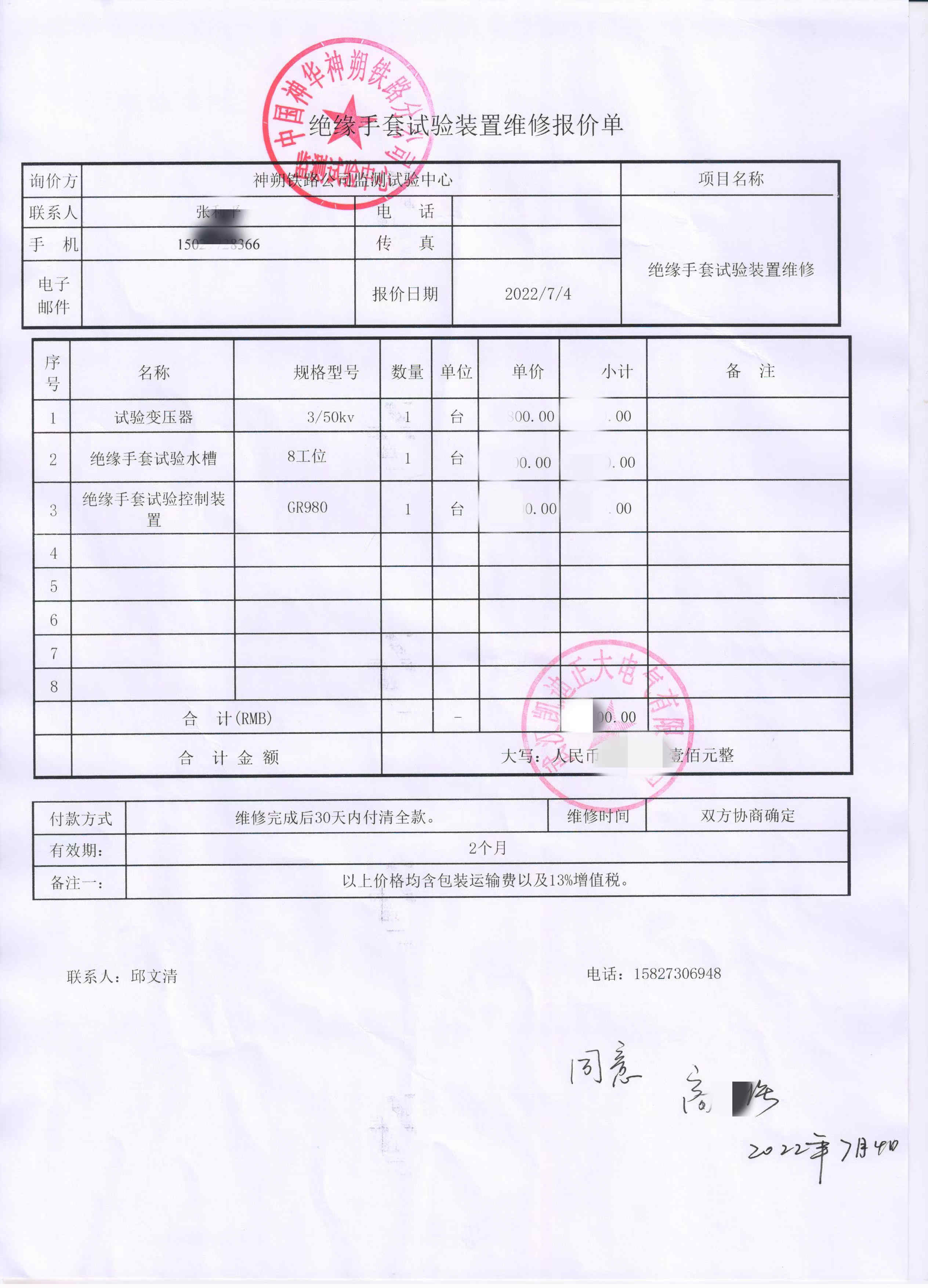 2022年,根據公司制度標準一體化建設工作部署,公司組織修訂了《國家電網公司質量監督工作規定》和《國家電網公司電力安全工器具管理規定》,經公司42014年第313次規章制度管理委員會審議通過,現予印發,請認真貫徹落實。需維修和置換全新KDJS-6絕緣手套試驗系統,包含8工位絕緣手套靴試驗水槽/3kvA50kV絕緣手套試驗升壓干式試驗變壓器、電氣設備交流碾壓試驗變壓器(油式10kvA150kV)等設備一批。