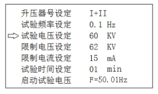 - 升壓器號(hào)設(shè)定:如果使用I號(hào)升壓器單獨(dú)升壓,升壓器號(hào)設(shè)定為I號(hào)(此時(shí)試驗(yàn)電壓設(shè)定≤30KV),如果使用I號(hào)升壓器和II號(hào)升壓器串聯(lián)升壓,升壓器號(hào)設(shè)定為I+II號(hào)。