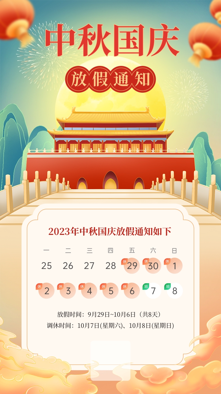 9月29日至10月6日放假調休,共8天,10月7日(星期六)、8日(星期日)上班。