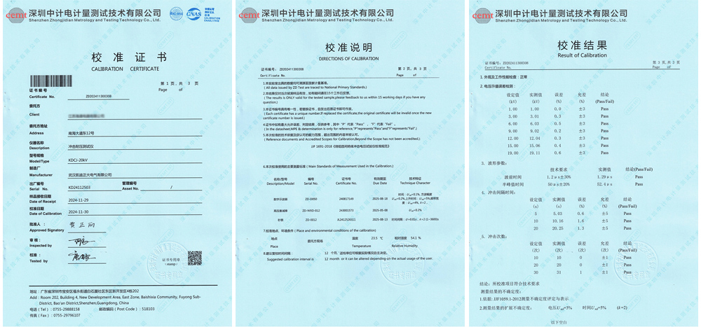 江蘇某電器有限公司采購武漢凱迪正大電氣有限公司的KDCJ-20kV沖擊耐壓測試儀、KDYD-FD放電試驗裝置、KDYD-ZY噪聲測試平衡負載系統(tǒng)、KD-IP2C防護等級試驗棒,通過深圳中計電計量測試技術(shù)有限公司的校準,并拿到校準報告。